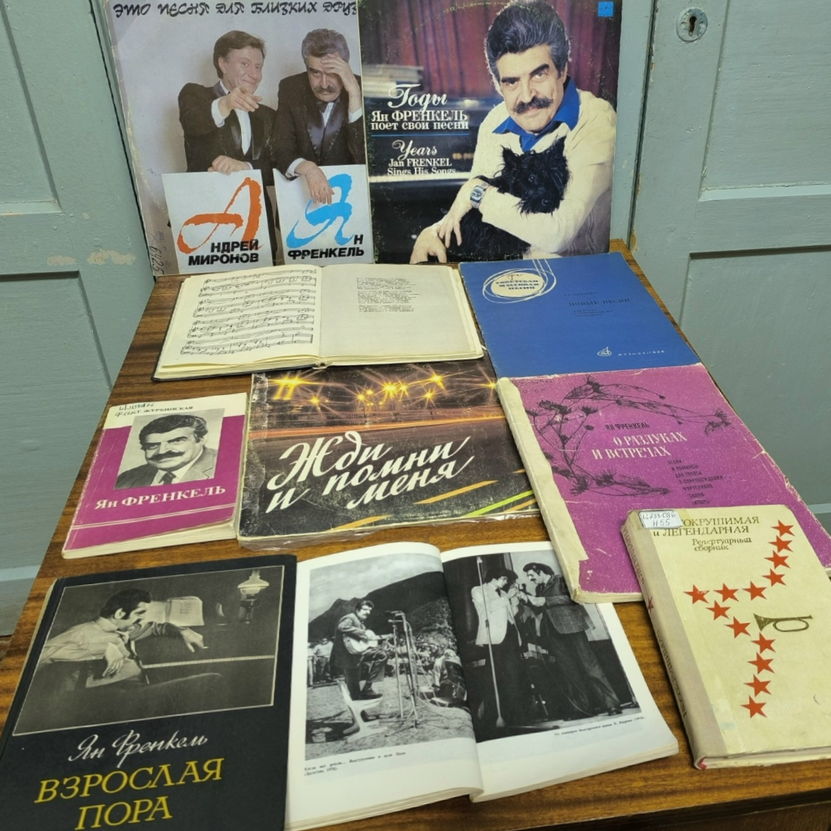 На выставке представлены сборники песен для голоса в сопровождении фортепиано, виниловые пластинки с песнями композитора, с его собственным исполнением своих песен. Интересная для ознакомления книга Т. Журбинской «Ян Френкель», где автор анализирует песни композитора, характеризует его деятельность в области музыки и влияние его творчества на духовный мир современников.