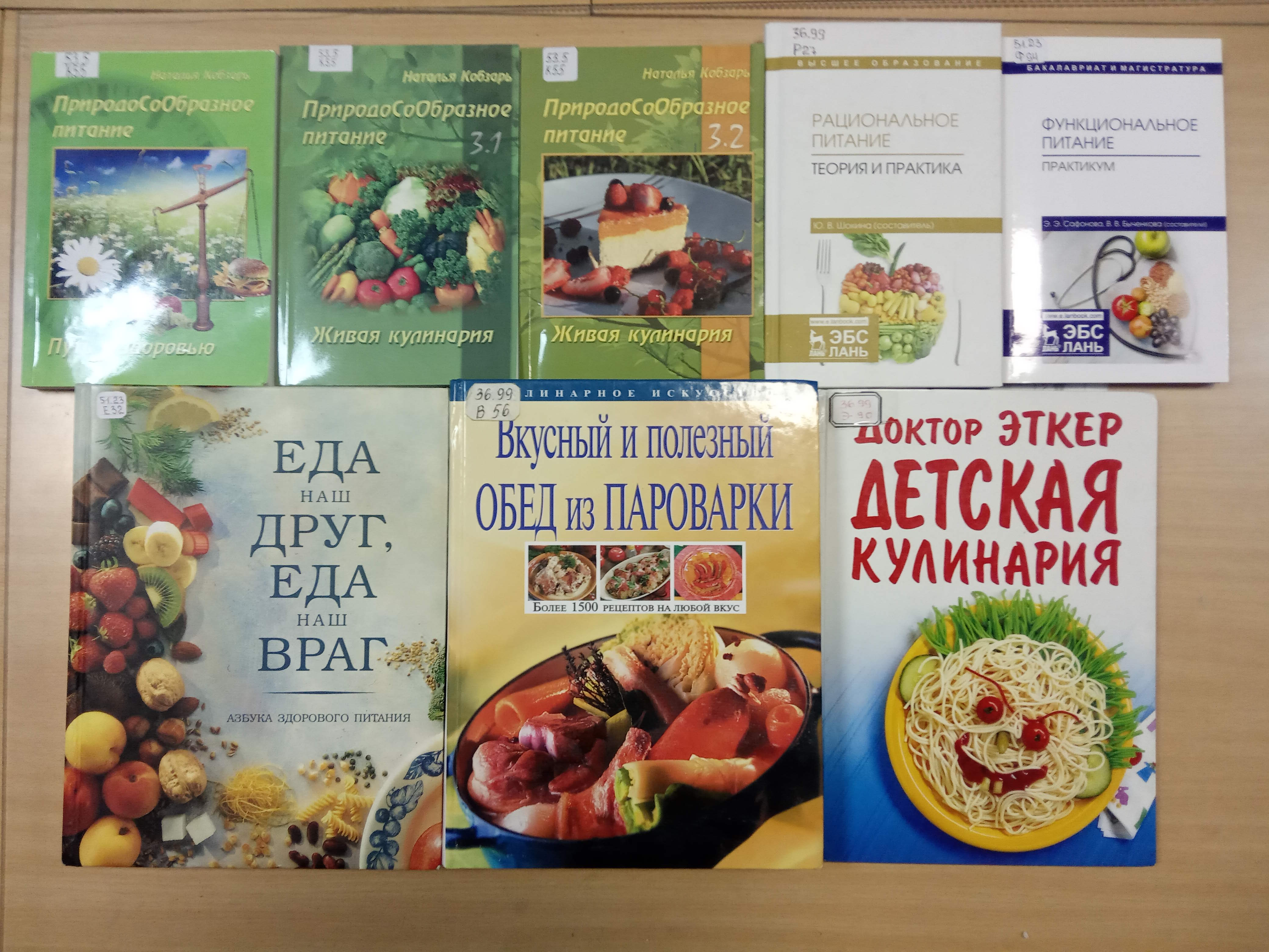 Экспозицию дополняют книги: «Еда наш друг, еда наш враг», «Поваренная книга без соли», «Поваренная книга без сахара», «Вкусный и полезный обед из пароварки», «Учимся готовить салаты».