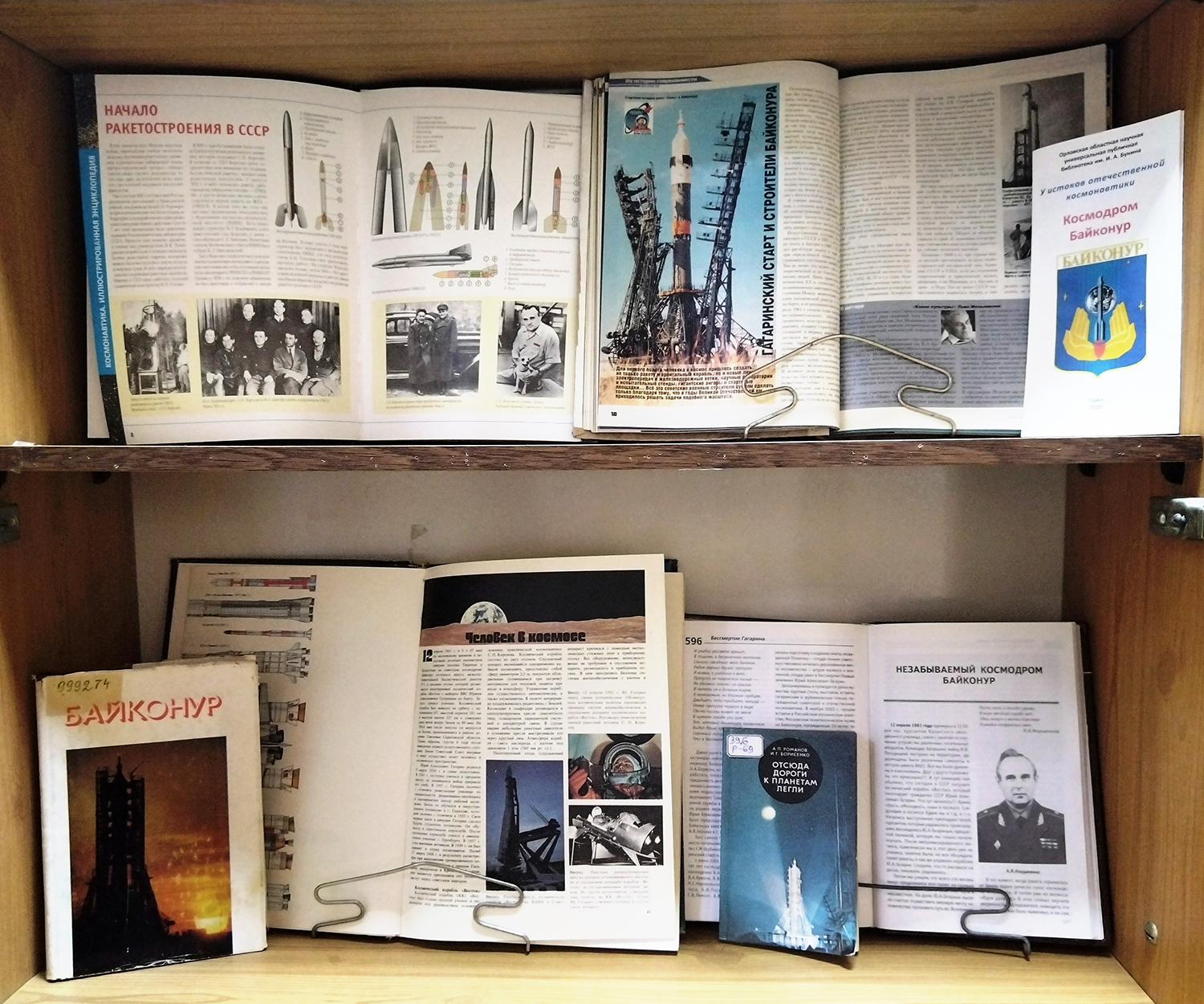 На экспозиции представлена литература, посвящённая космодрому Байконур и космонавтике.