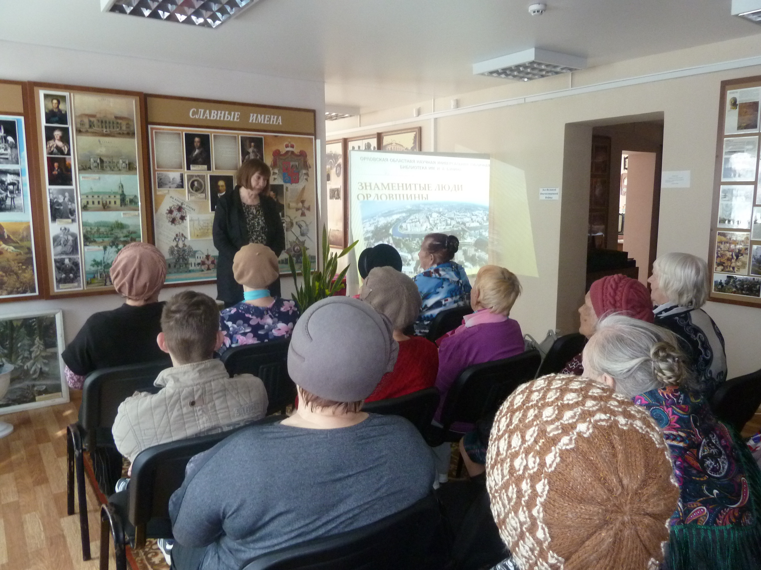 Мероприятие «Кинематограф в лицах» подготовлено в рамках реализации проекта «Знаменитые люди Орловского края». Представляет собой познавательный и информационный материал о знаменитых актёрах и режиссёрах, наших земляках, прославляющих своими достижениями не только Орловский край, но и всю Россию. Сотрудник библиотеки знакомит слушателей с биографией, актёрской и режиссёрской деятельностью наших соотечественников. Выступление сотрудника сопровождается документальными кадрами архивными фото, кадрами из современного кинематографа. В материале отображены знаменитые люди Орловского края: