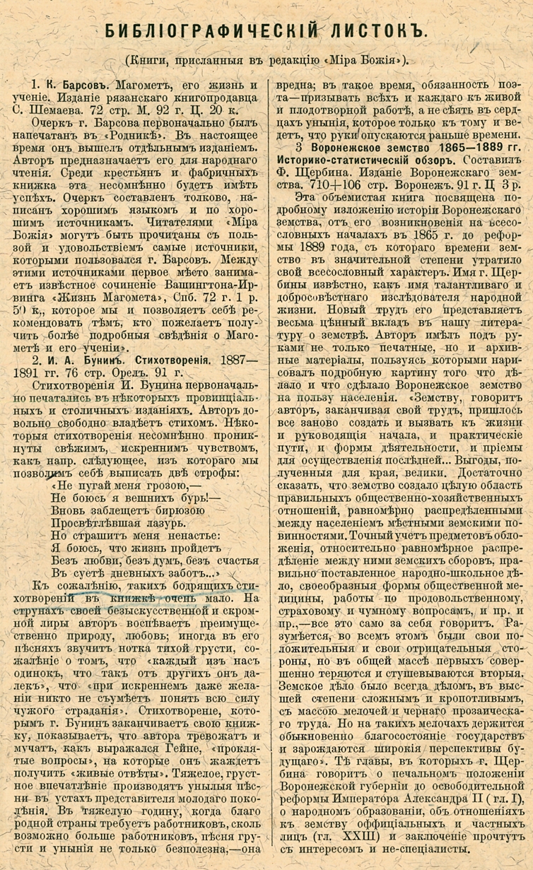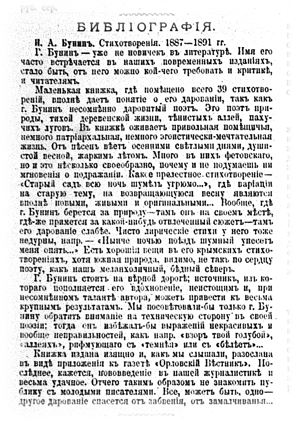 Небольшая неподписанная заметка в разделе «Библиография» на стр. 106 этого журнала была к Бунину безжалостна [12]. Согласно библиографии С. Н. Морозова, она принадлежит Ивану Ивановичу Иванову, который выступал в печати как литературный и театральный критик. 4 года спустя, в 1896-м, Иванов опубликовал увесистый том жизнеописания другого нашего земляка – Ивана Тургенева (эта книга доступна онлайн на многих ресурсах [13], в т.ч. на сайте университетской библиотеки Торонто).