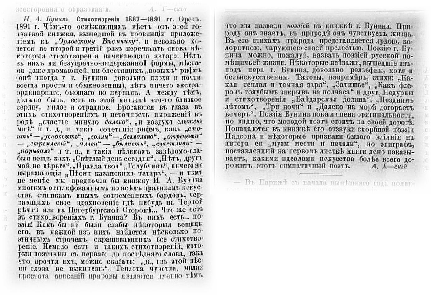 Итак, согласно ресурсу «Академический Бунин» и библиографии литературы о Бунине, составленной С. Н. Морозовым при участии А. В. Бакунцева [9], первый отзыв о книге Бунина «Стихотворения» (Орёл, 1891 год) появился в «театральном, музыкальном и художественном» московском журнале «Артист» (№ 20 за 1892 год) [10].