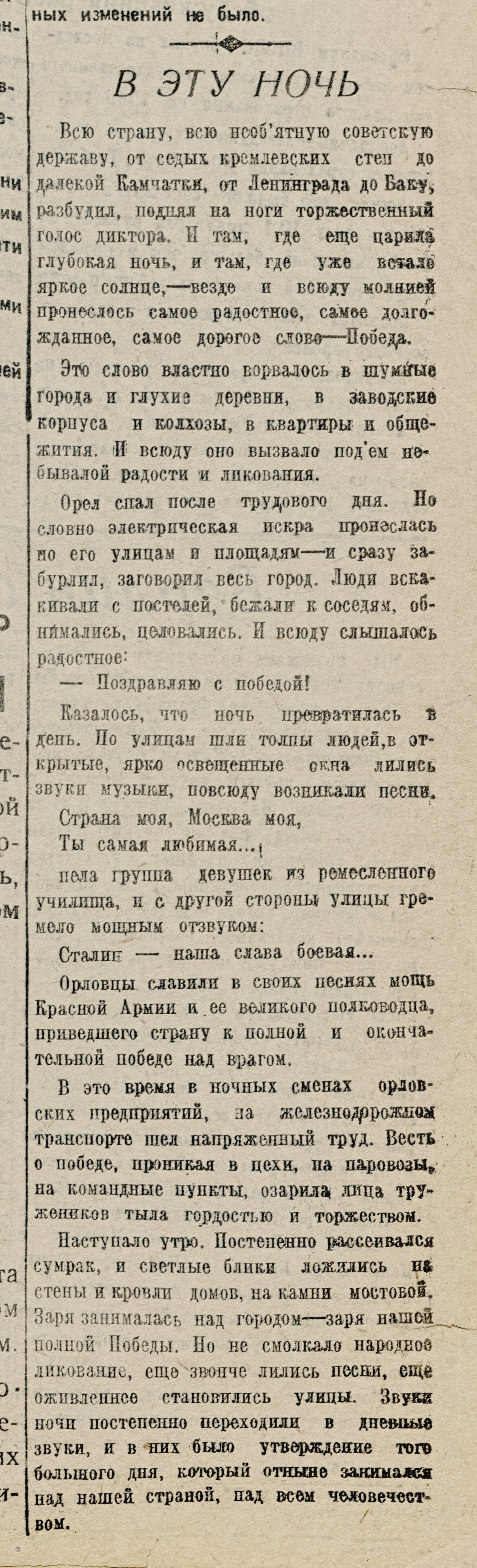 эту ночь // Орловская правда. – 1945. – 9 мая. – С. 1. ![]()