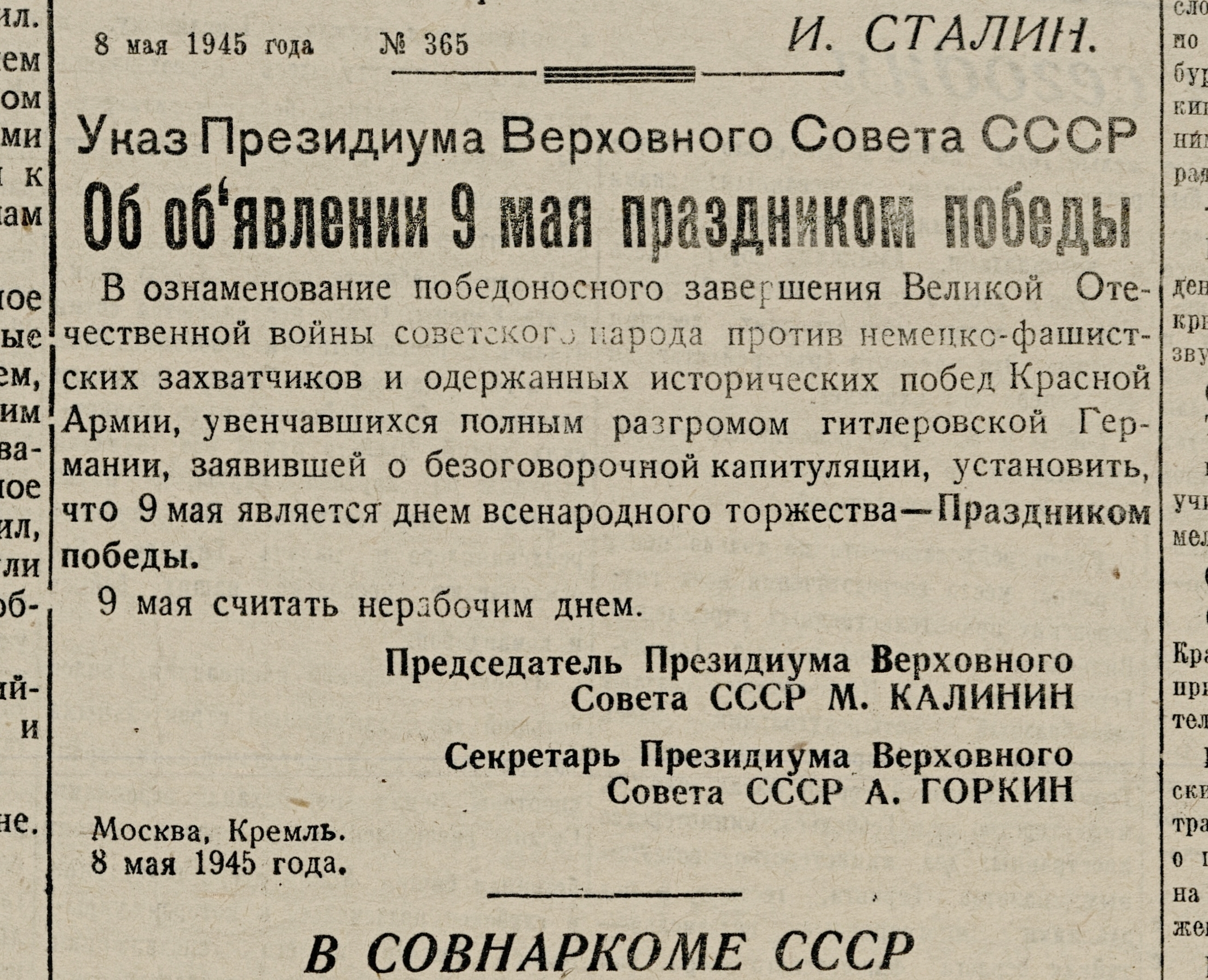 объявлении 9 мая праздником победы : Указ Президиума Верховного Совета СССР :