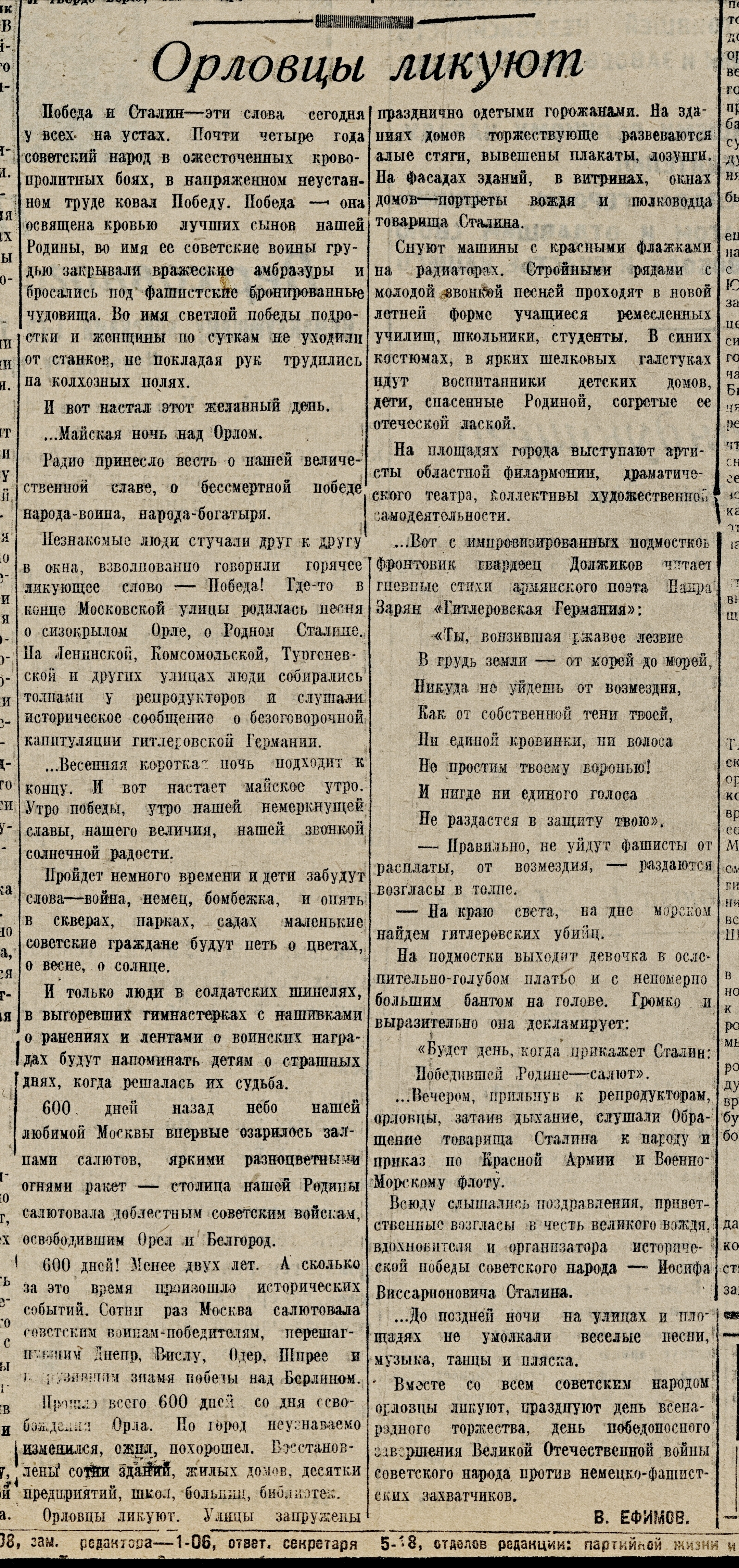 В. Орловцы ликуют / В. Ефимов // Орловская правда. – 1945. – 10 мая. – С. 2.