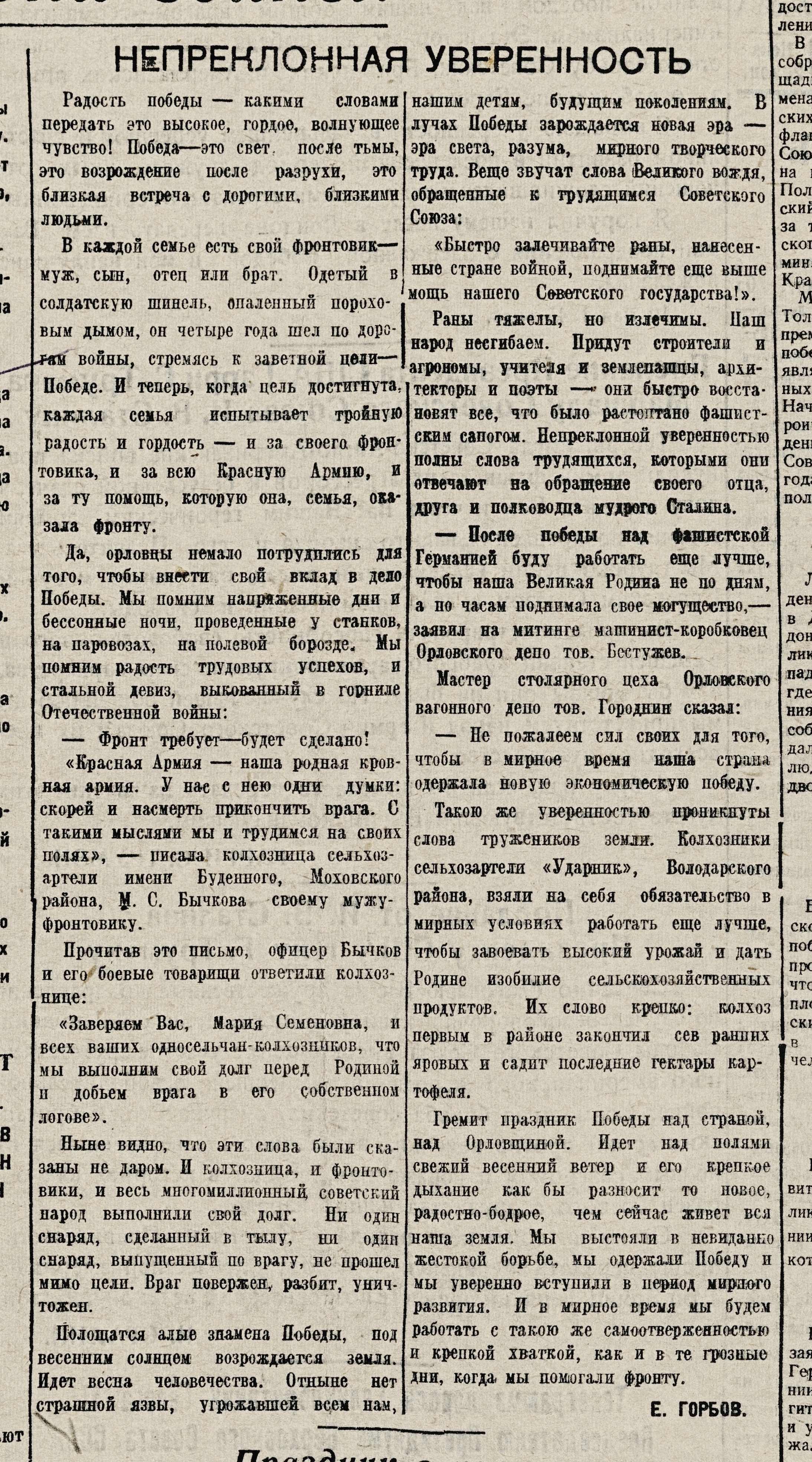 Е. Непреклонная уверенность / Е. Горбов // Орловская правда. – 1945. – 12 мая.