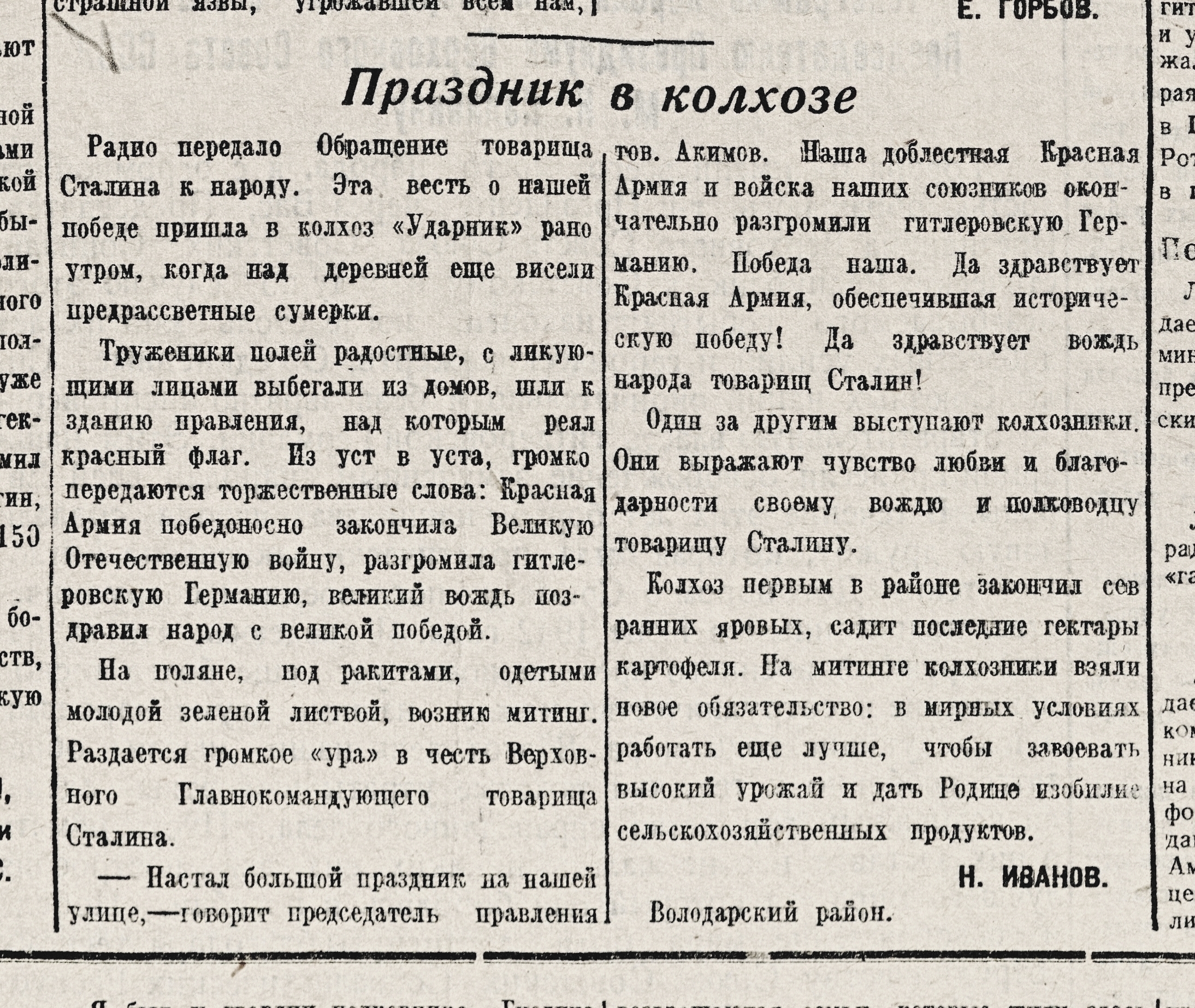 Н. Праздник в колхозе / Н. Иванов // Орловская правда. – 1945. – 12 мая. – С.