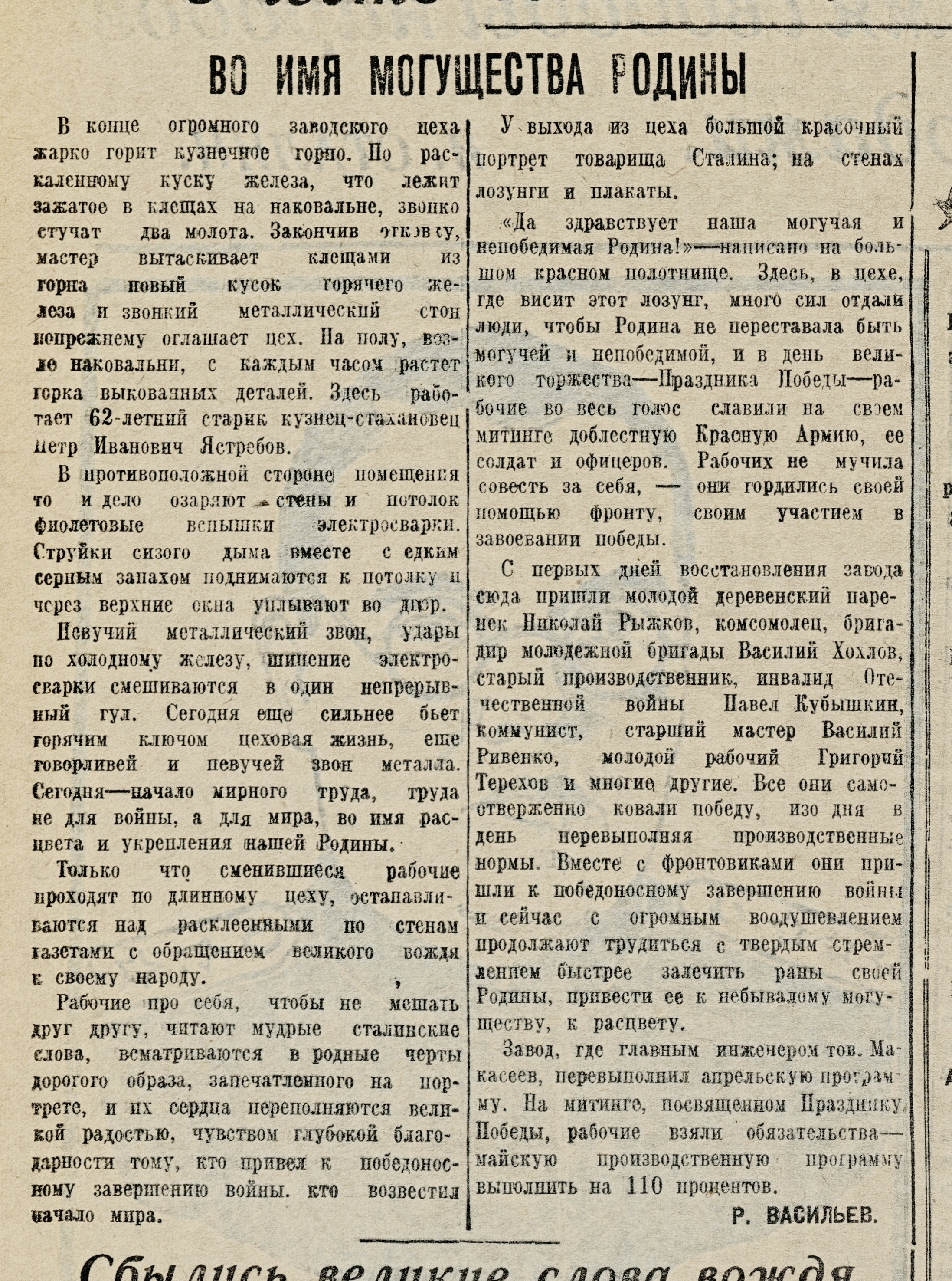 Р. Во имя могущества Родины / Р. Васильев // Орловская правда. – 1945. – 13