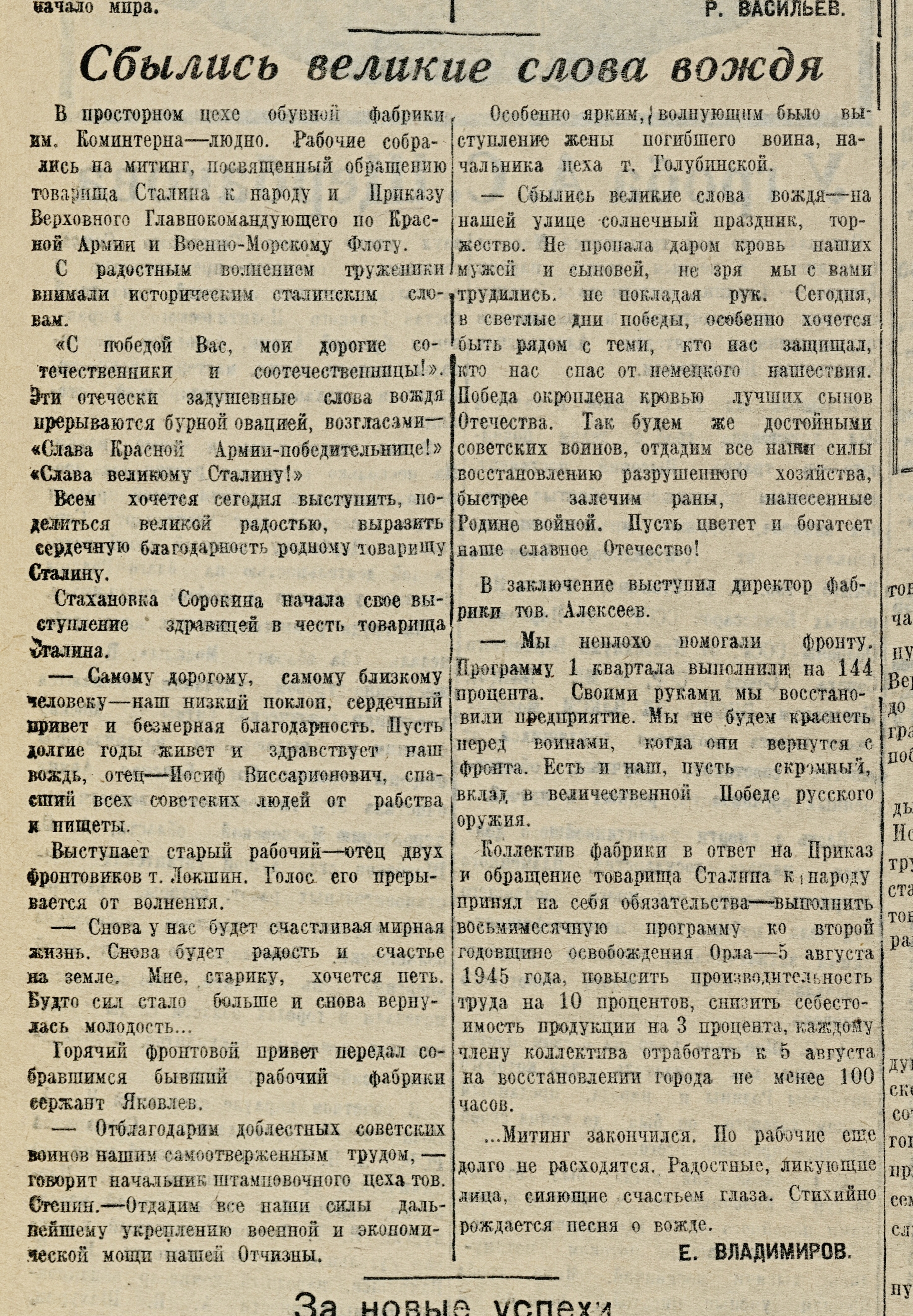 Е. Сбылись великие слова вождя / Е. Владимиров // Орловская правда. – 1945. –