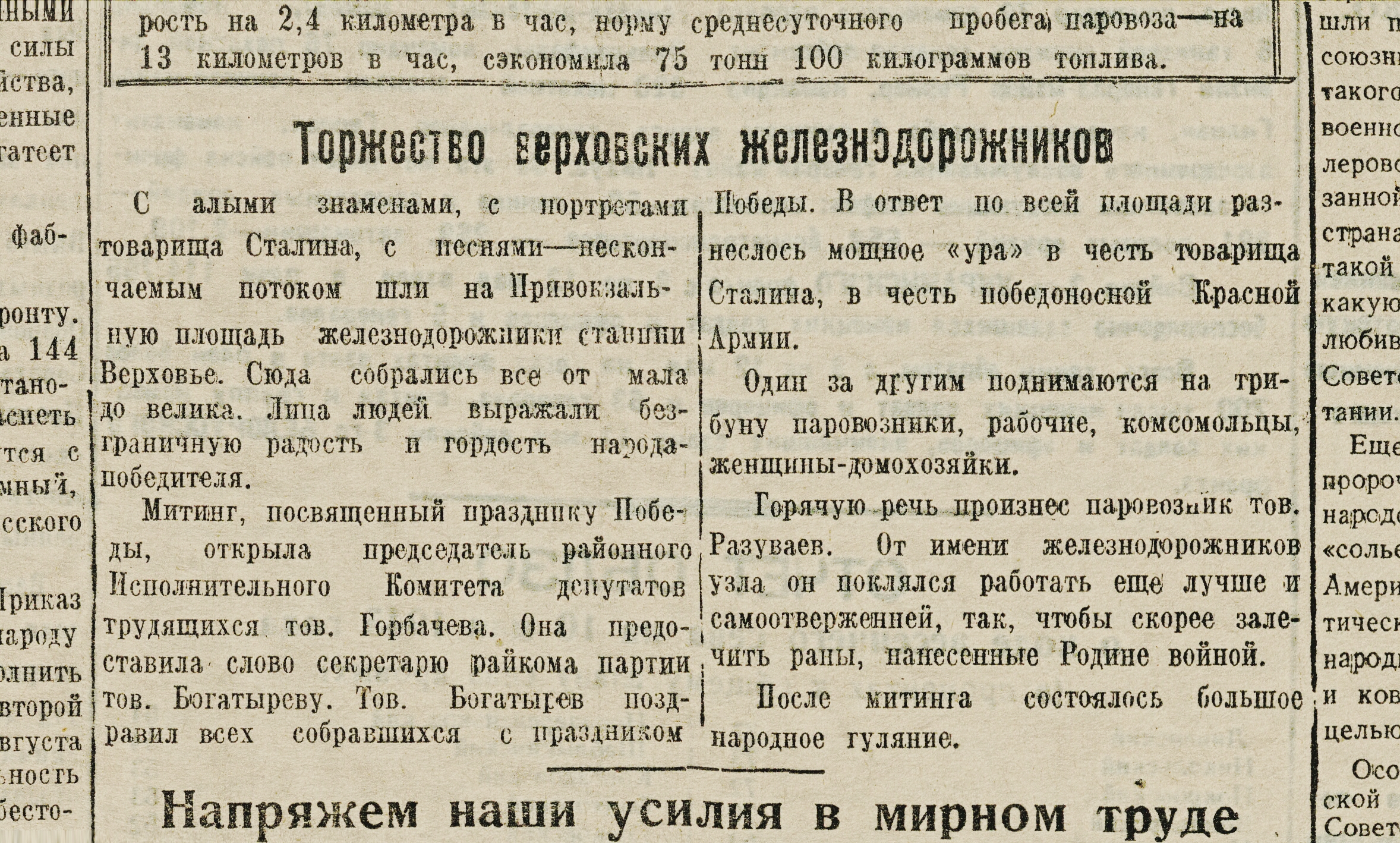 верховских железнодорожников // Орловская правда. – 1945. – 13 мая. – С. 2.