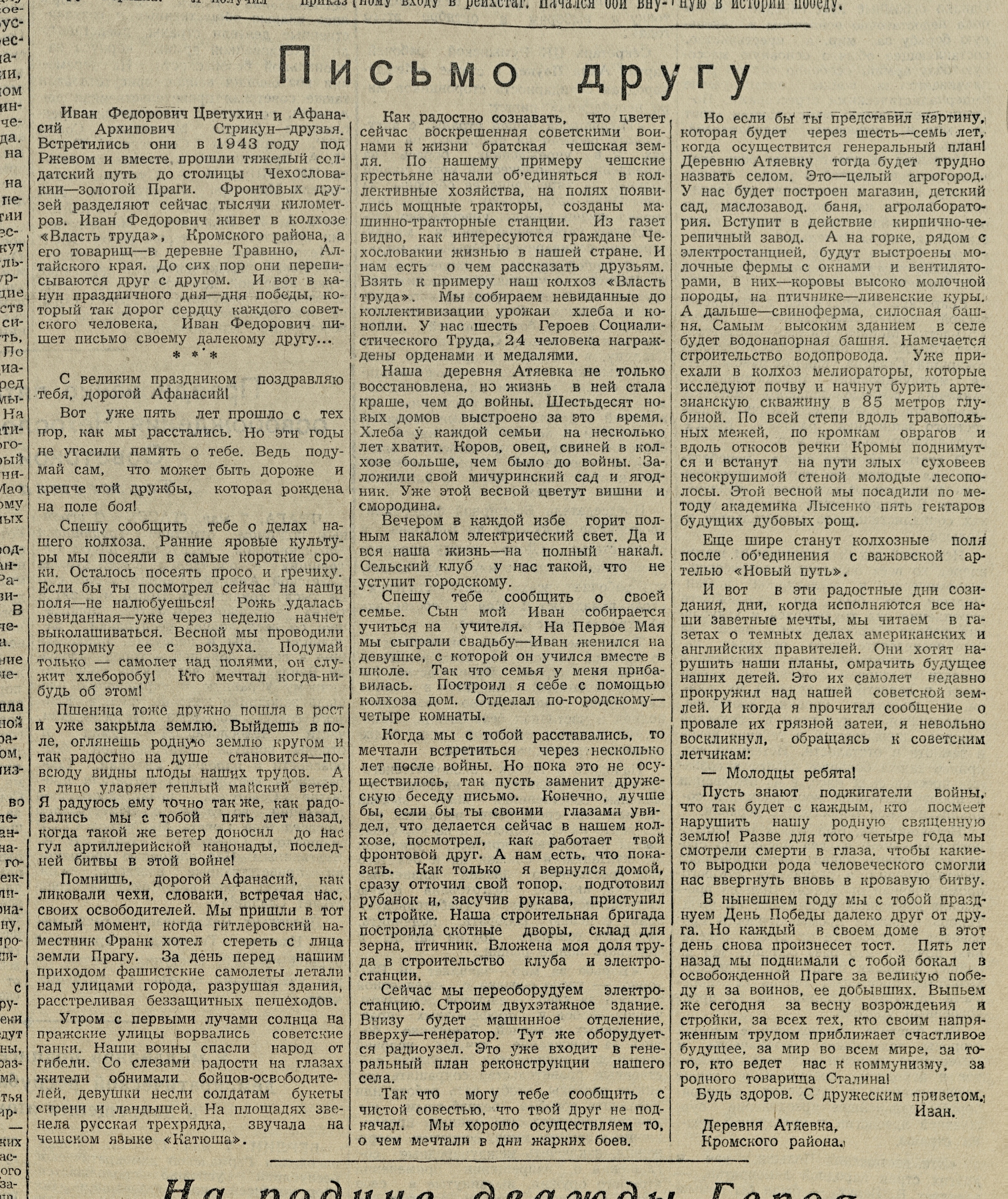 « Письмо другу // Орловская правда. – 1950. – 9 мая. – С. 3.