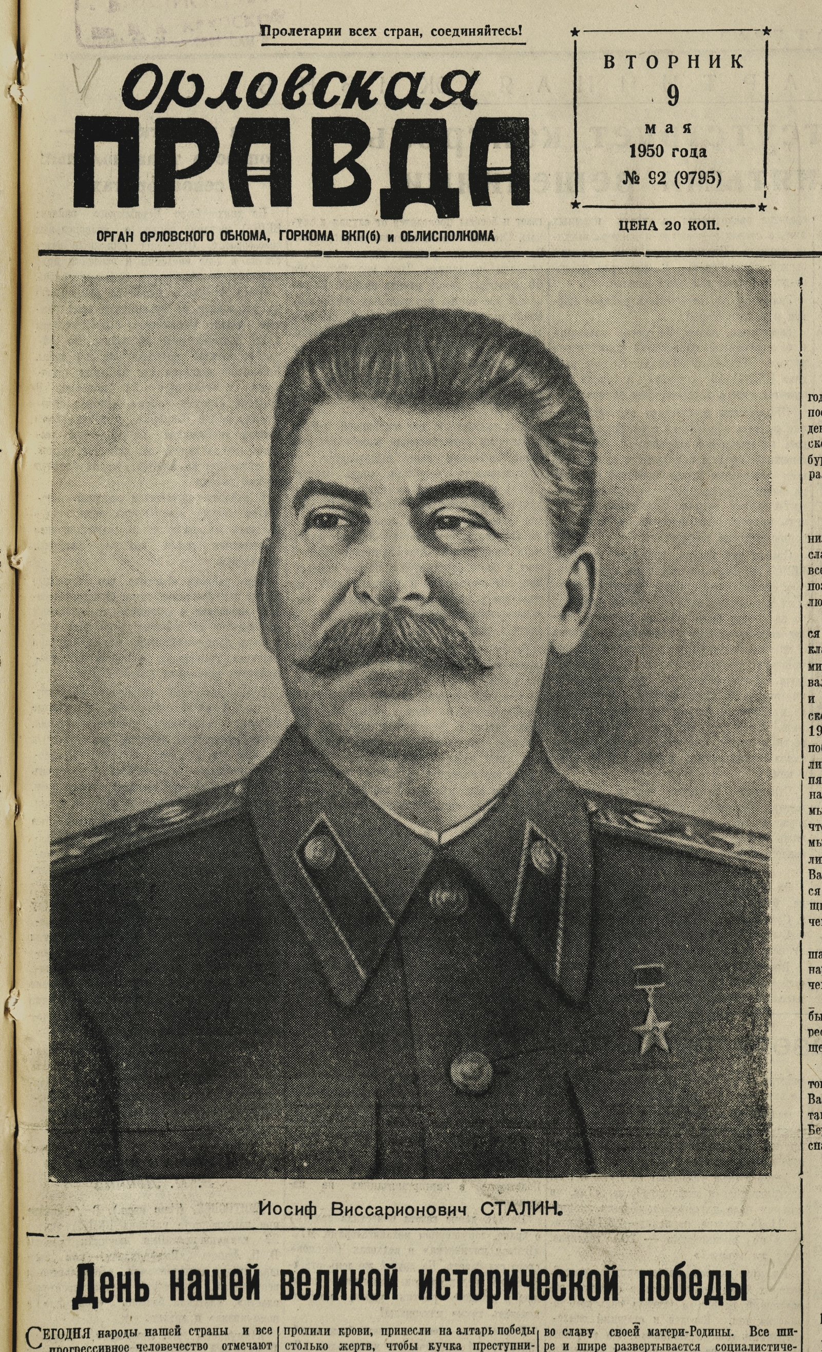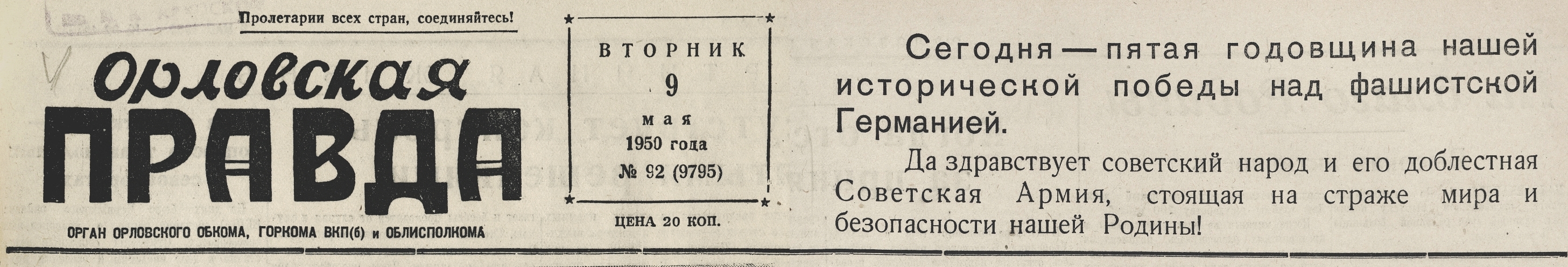 « [«Шапка» номера с праздничным воззванием] // Орловская правда. – 1950. – 9 мая. – С. 1.