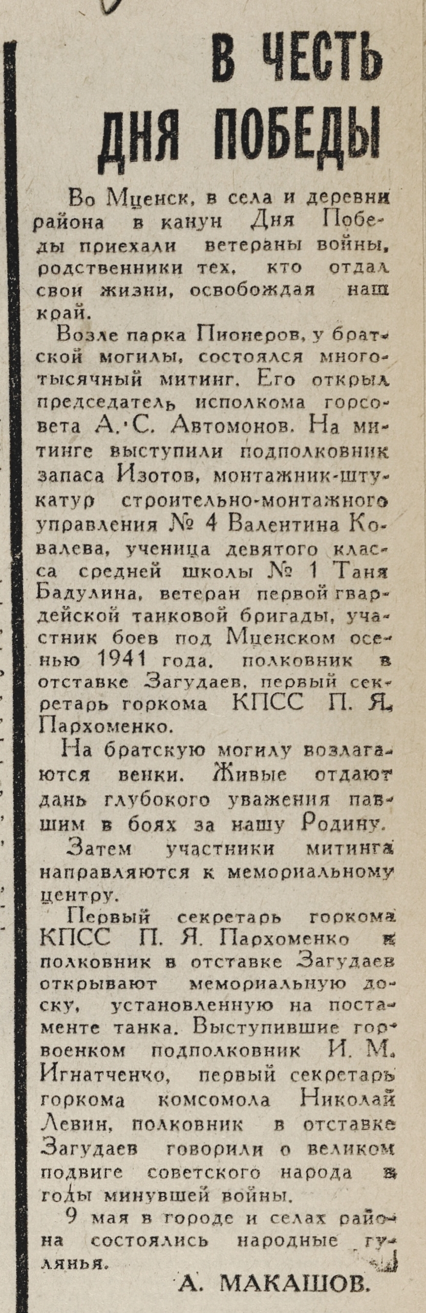 « Макашов, А. В честь Дня Победы / А. Макашов // Орловская правда. – 1970. – 12 мая. – С. 3.