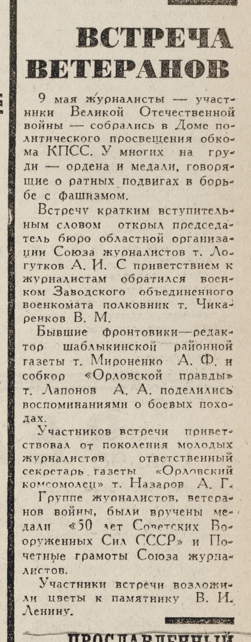 « Встреча ветеранов // Орловская правда. – 1970. – 12 мая. – С. 3.