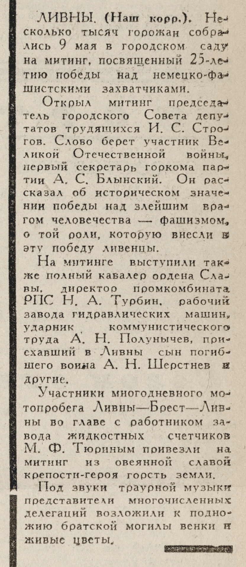 « [Праздничный митинг в г. Ливны, посвящённый 9 мая] // Орловская правда. – 1970. – 12 мая. – С. 3.