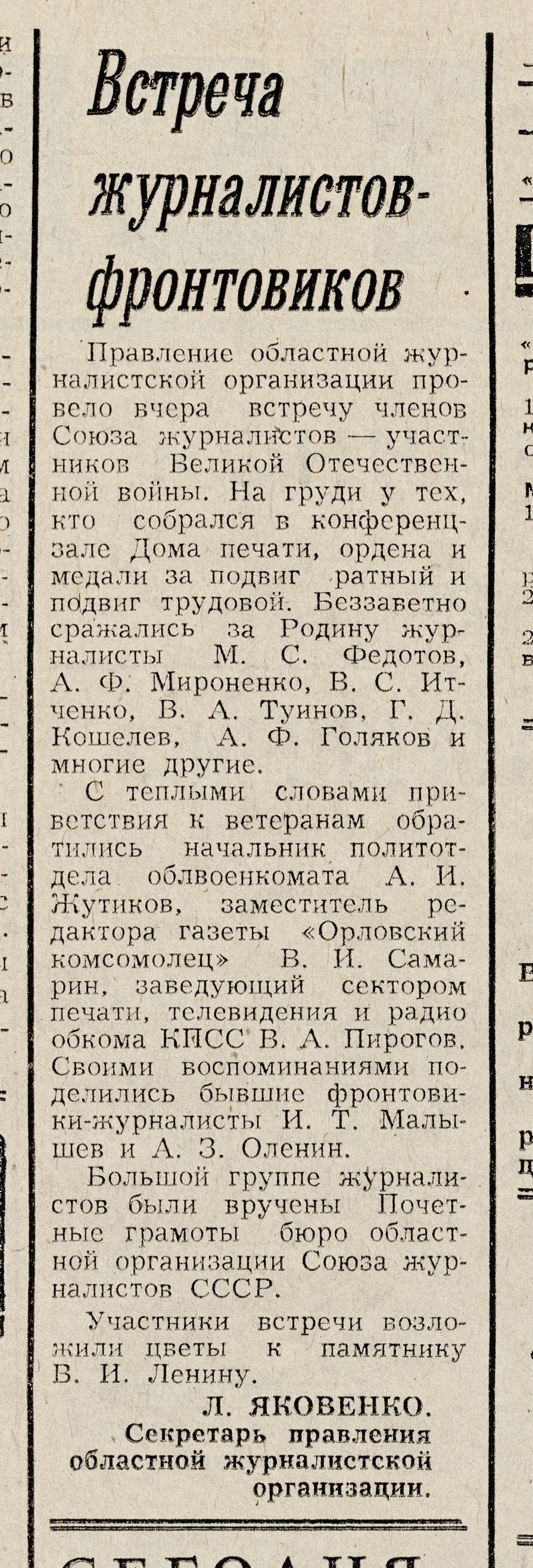 « Яковенко, Л. Встреча журналистов-фронтовиков / Л. Яковенко // Орловская правда. – 1980. – 9 мая. – С. 4.