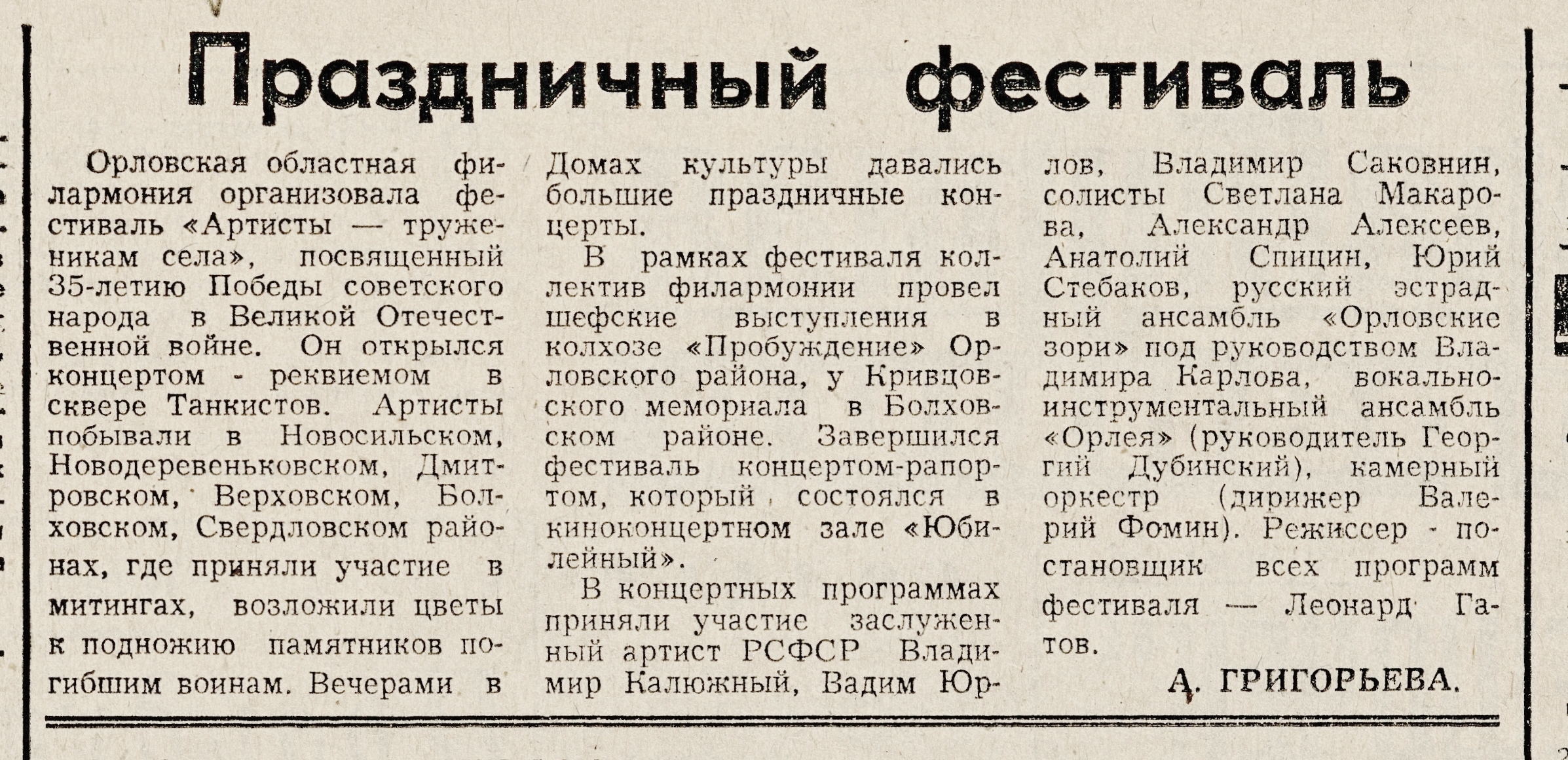 « Григорьева, А. Праздничный фестиваль / А. Григорьева // Орловская правда. – 1980. – 11 мая. – С. 4.