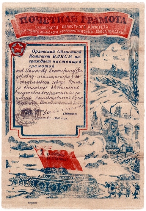<...> В 1943 году, когда освободили город Орёл, она работала в войсках МВД, за что имеет грамоту.