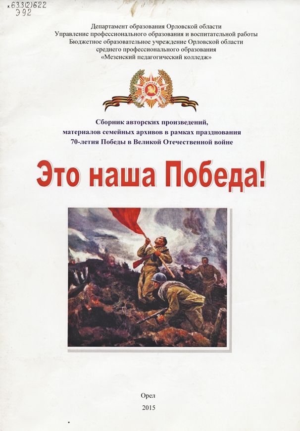 « Это наша Победа! : сборник авторских произведений, материалов семейных архивов в рамках празднования 70-летия Победы в Великой Отечественной войне. — Орёл : МПК, 2015. — 64 с. |